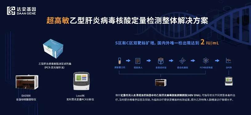 達(dá)安基因在病原體核酸檢測(cè)領(lǐng)域形成了日臻豐富的解決方案,助力臨床疾病的精準(zhǔn)診療。達(dá)安基因最新上市的超高敏乙型肝炎病毒核酸定量檢測(cè)試劑及整體解決方案,是國(guó)內(nèi)外唯一檢出限達(dá)2 IU/mL,滿(mǎn)足權(quán)威指南高靈敏精準(zhǔn)檢測(cè)要求;針對(duì)S區(qū)和C區(qū)雙靶標(biāo)擴(kuò)增,提高對(duì)病毒變異株檢出,積極朝著實(shí)現(xiàn)“消除病毒性肝炎”的目標(biāo)邁進(jìn)。
