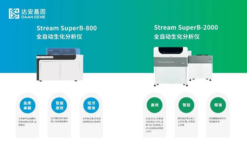 截至目前,達(dá)安基因已上市的生化產(chǎn)品主要包括兩款全自動(dòng)生化分析儀(Stream SuperB-800、Stream SuperB-2000)以及112種檢測(cè)項(xiàng)目,能夠全面地滿(mǎn)足臨床需求。